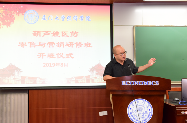 在开班仪式上,廖景峰主任首先代表厦门大学经济学院热烈欢迎葫芦娃医药零售与营销研修班的学员到厦大学习,并就厦门大学及经济学院的相关情况进行了介绍。他说,葫芦娃学员走进厦大就是厦大的校友,希望未来的日子能够关心、支持母校的发展,多提宝贵意见,同时他也祝大家在厦大学习期间学有所成、学有所获。