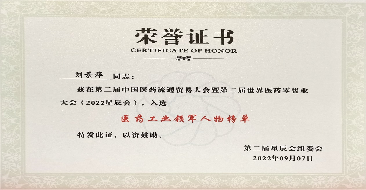 本次星辰会期间,葫芦娃斩获颇丰,获得多项行业奖项及荣誉。在开幕式上,刘景萍董事长荣获“医药工业领军人物”称号。