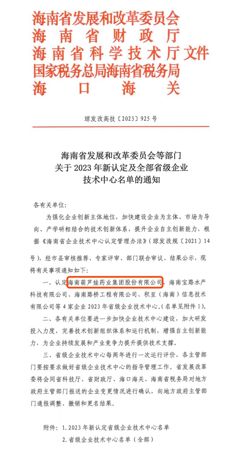 近日,海南省发改委等多部门联合公布了《关于2023年新认定及全部省级企业技术中心名单的通知》,其中,海南葫芦娃药业集团股份有限公司成功通过评审,被认定为省级企业技术中心,是本次获批的4家企业之一。